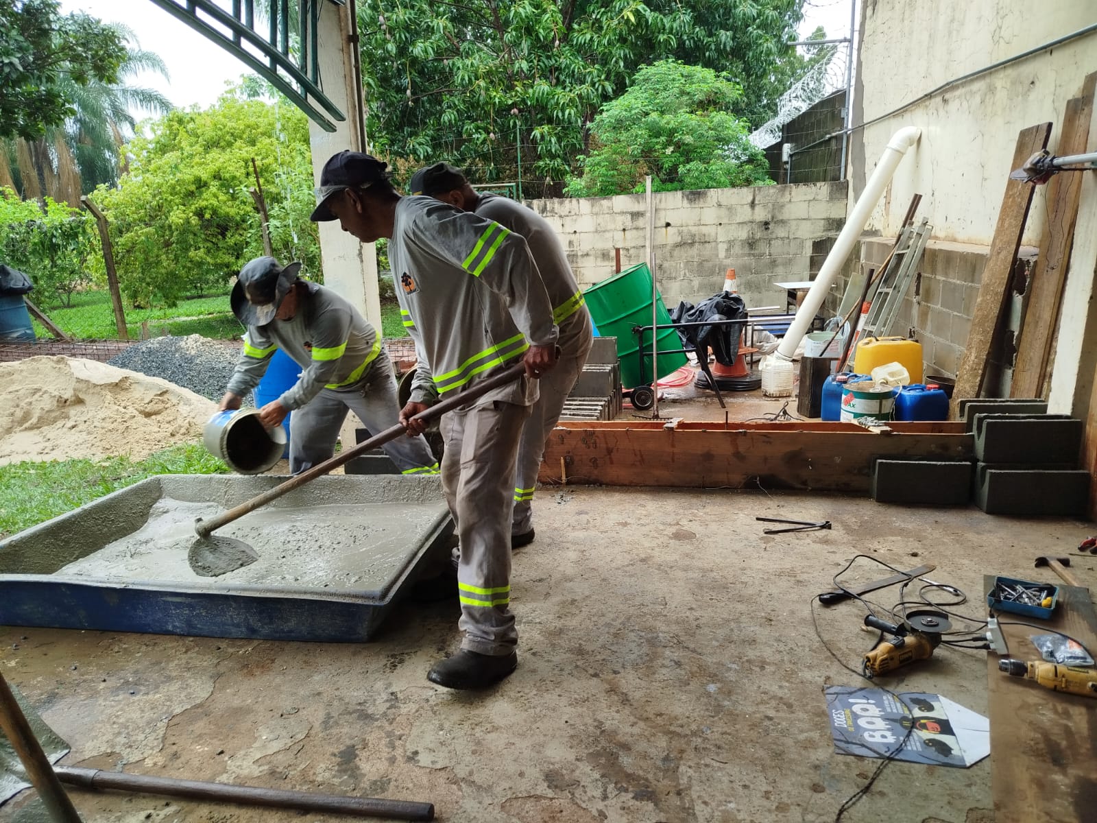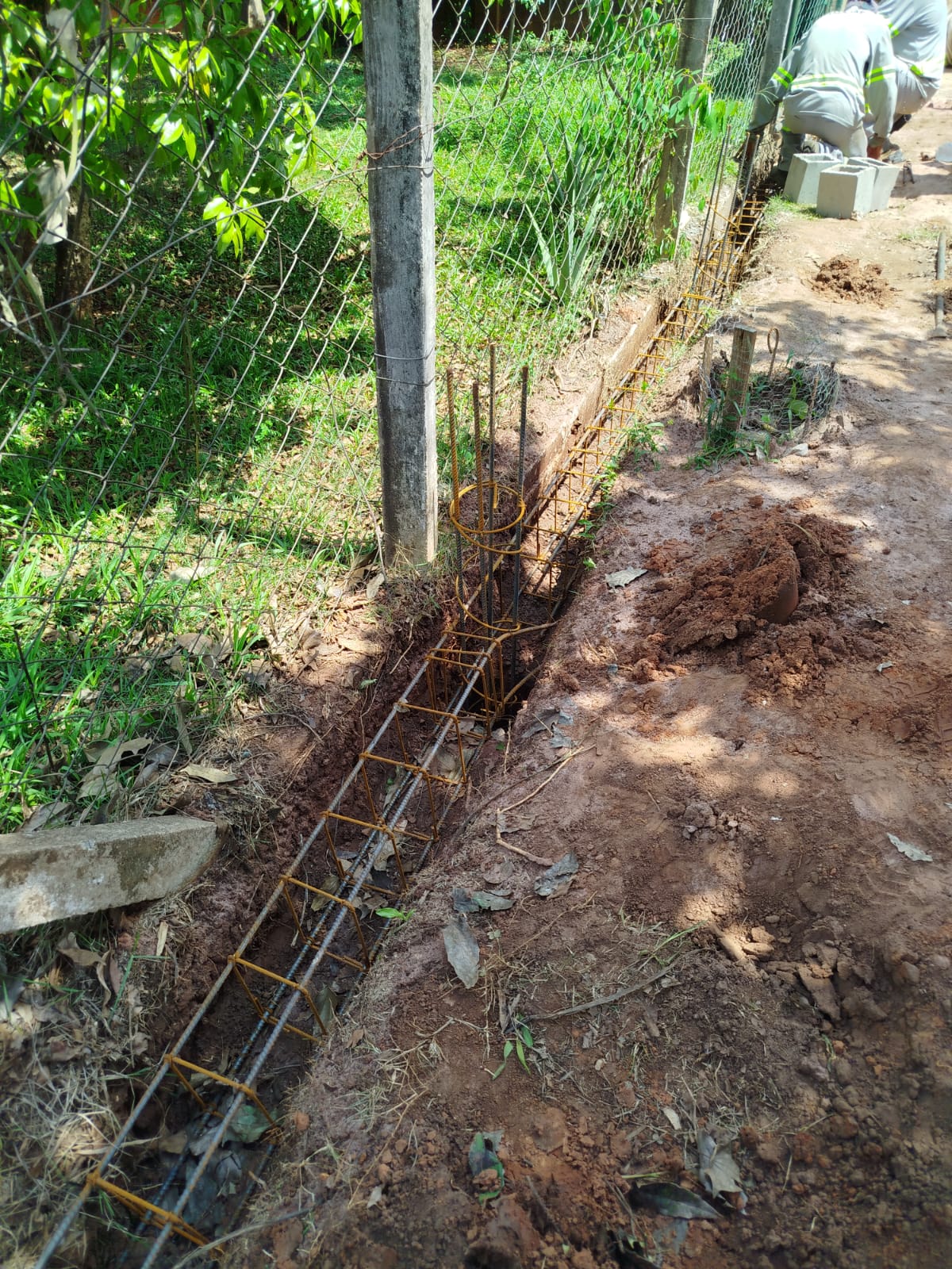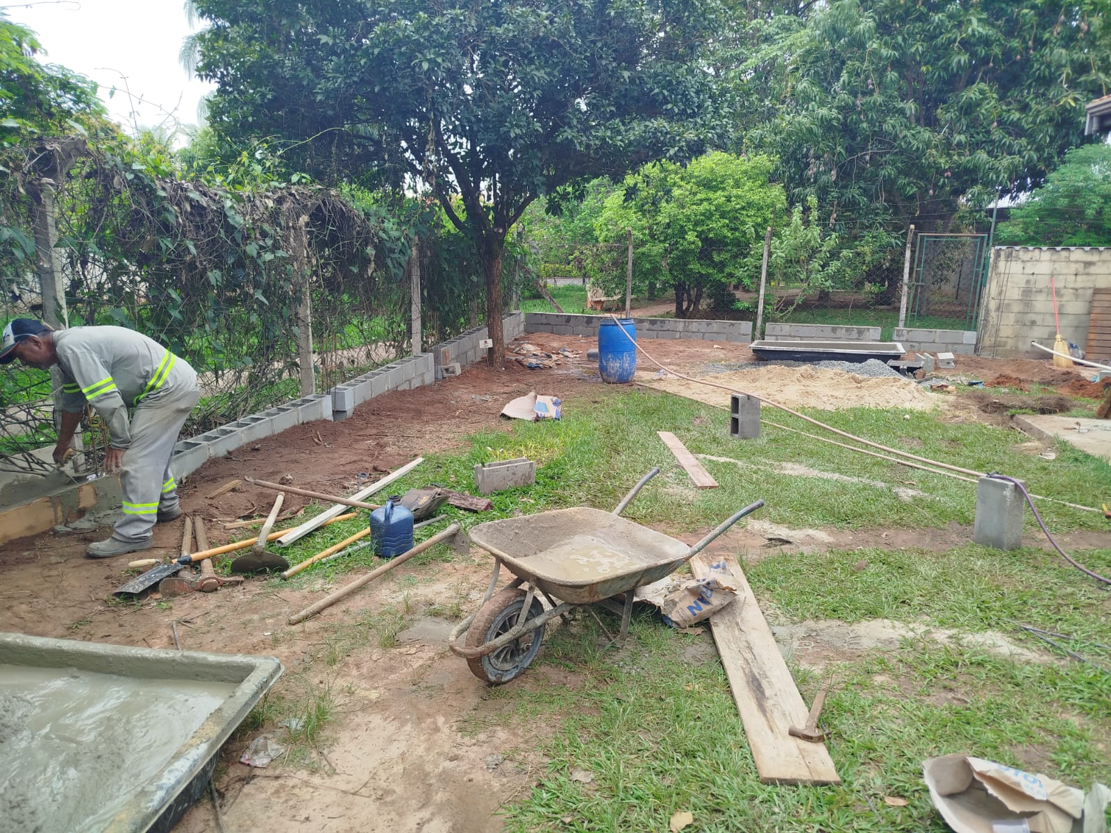 Foram feitos o nivelamento do solo, a terraplenagem e o muro de arrimo. Além de oficina lateral com portão, telhado e calha e instalação de guardo corpo, pia e ventilador.