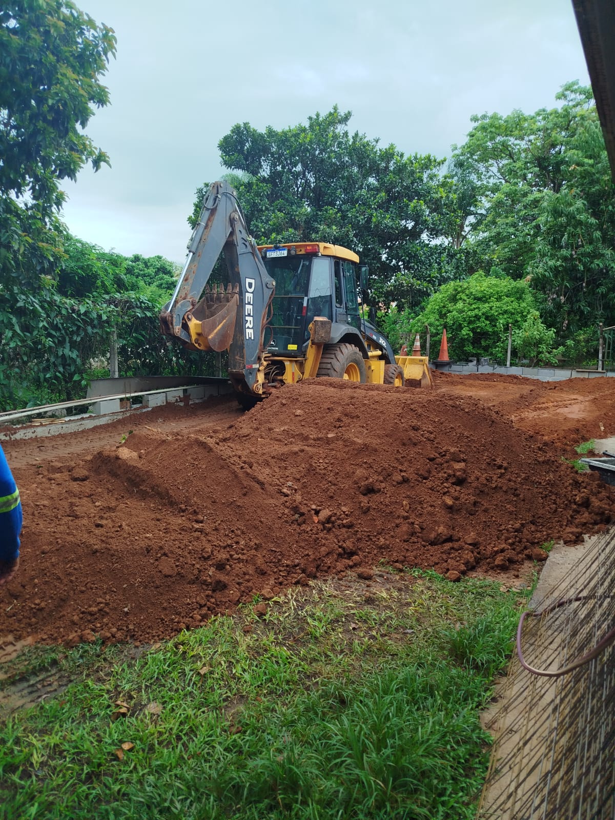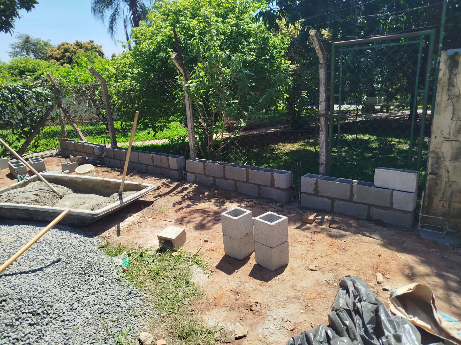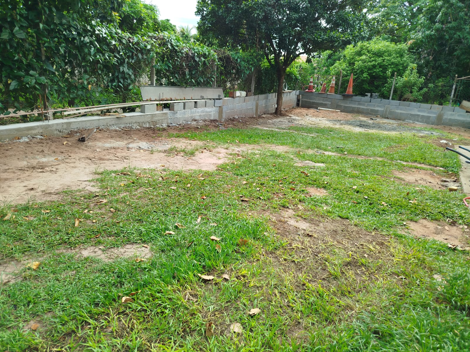 Foram feitos o nivelamento do solo, a terraplenagem e o muro de arrimo. Além de oficina lateral com portão, telhado e calha e instalação de guardo corpo, pia e ventilador.